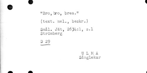 //// "Bro, b-o, brea." //// (text. mel., beskr.) //// Smål. Jät, 2634:1, s.l //// Strömberg //// D 29 //// ULMA //// Sånglekar ////