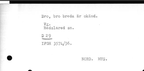 //// Bro, bro breda är okänd. //// Vg. //// Redslared sn. //// D 29_ //// IFGH 3574/56. //// # NORD. MUS. ////