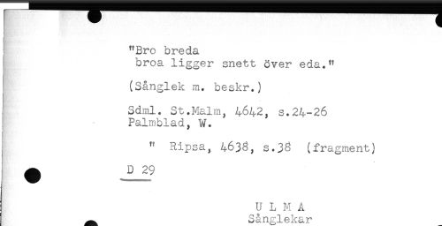 //// "Bro breda //// broa ligger snett över eda." //// (Sånglek m. beskr.) //// Sdml. St.Malm, 4642, s.24-26 //// Palmblad, W. //// " Ripsa, 4638, s.38 (fragment) //// ULMA //// ^ Sånglekar ////