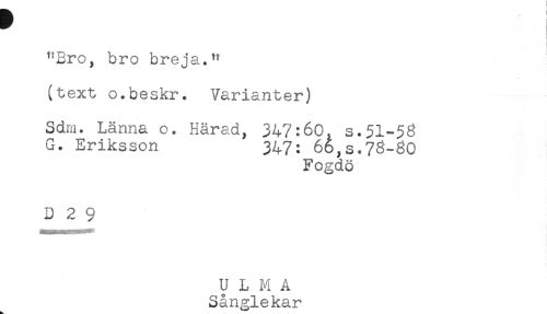 //// "Bro, bro breja." //// (text o.beskr. Varianter) //// Sdm. Länna o. Härad, 347:60, s.51-$3 //// G. Eriksson 347: 66,s.73-30 //// Fogdö //// D 2 9 //// ULMA //// Sånglekar ////