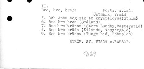 //// Bro, bro, breja ^ Forts, s.144. //// östmark, Vrmld //// ^ Cch Anna tog sig en knyppeldyna(Sthlm§) //// 6. Bro bro brea (Småland) //// 7.. Bro bro bränna (Stora Lundby,Västergtld) //// .6, Bro bro bräda {Kilanda, Väs^ergtld) //// 9. Bro bro bränna (Tunge h:d, Bohuslän) //// STRÖM. SV. VISOR o.RAMSOR. ////