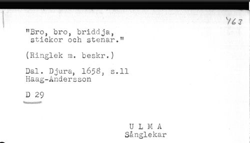 //// ; y //// "Bro, bro, briddja, //// stickor och stenar." //// < //// (Ringlek m. beskr.) //// ! //// Dal. Djura, 1656, s.ll ! //// Haag-Andersson //// 1 //// D 29 //// ! //// t //// t //// i //// ULMA //// Sånglekar ////