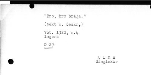 //// - //// "Bro, bro bräja." //// (text o. beskr,) //// ^ Vbt. 1322, s.4 //// , Ingers //// I D 29 //// i //// U L M A //// ^ Sånglekar ////