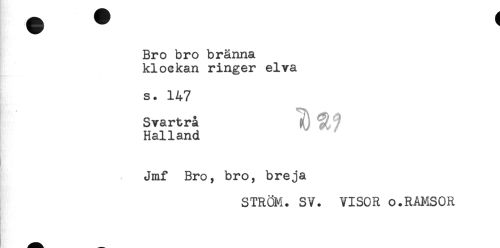 //// Bro bro bränna //// klockan ringer elva //// s. 147 //// Svartrå 7) //// Halland //// Jmf Bro, bro, breja ////