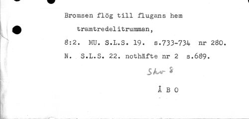//// Bromsen flög till flugans hem //// ^ tramtredelitrumman. //// 3:2. MU. S.L.S. 19. s.733-734 nr 230. //// N. S.L.S. 22. nothäfte nr 2 s.639. //// S //// ÅBO ////