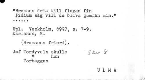 //// "Bromsen fria till flugan fin //// Pidium säg vill du bliva gumman min." //// + ++* + + [ //// < //// Upl. Yeckholm, 6997^ s. 7-9. //// Karlsson, S. ; //// < //// (Bromsens frieri). //// Jmf Tor dy ve In skulle ^ //// " han //// Torbaggen //// ULMA ////
