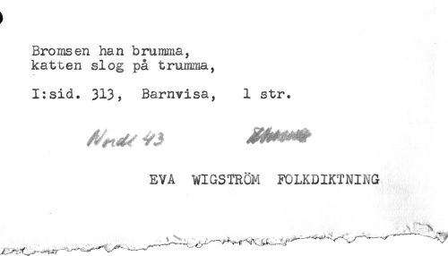 //// Bromsen han brumma, //// katten slog på trumma, //// I:sid. 313, Barnvisa, 1 str. //// EVA WIGSTROM FOLKDIKTNING ////