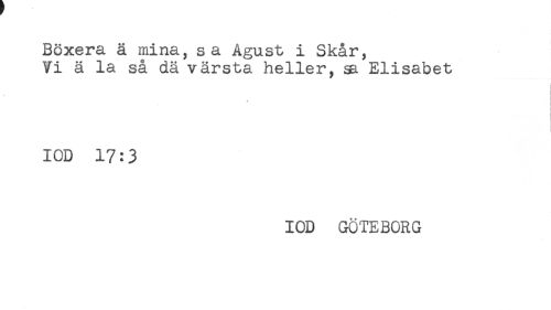 //// Böxera ä mina, sa Agust i Skar, //// Vi ä la så dä värsta heller, sa Elisabet //// < //// ' //// < //// i //// IOD 17:3 //// IOD GÖTEBORG ////