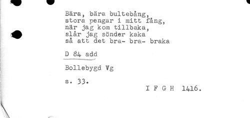 //// Bära, bära bultebång, //// stora pengar i mitt fång, //// när jag kom tillbaka, //// slår jag sönder kaka //// så att det bra- bra- braka //// D 84 add //// i Bollebygd Vg //// s. 33. //// I F G H 1416. //// !{ //// R* //// Ha ////