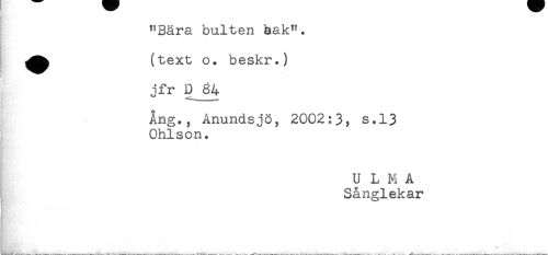 //// "Bära buiten bak". //// ^^ (text o. beskr.) //// F - //// jfr //// Ang., Anundsjö, 2002:3, s.13 //// Ohlson. //// U L M A //// Sånglekar ////