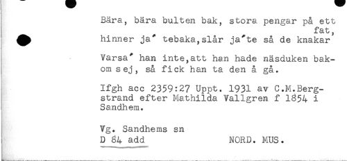 //// Bära, bära bulten bak, stora pengar på ett //// fat, //// ^ hinner ja/ tebaka,slår ja*te så de knakar //// Varsa" han inte,att han hade näsduken bak- //// om sej, så fick han ta den å gå. //// Ifgh acc 2359:27 Uppt. 1931 av C.M.Berg- //// strand efter Mathilda Vallgren f 1854 i //// Sandhem. //// Vg. Sandhems sn //// DJ34 add NORD. MUS. ////