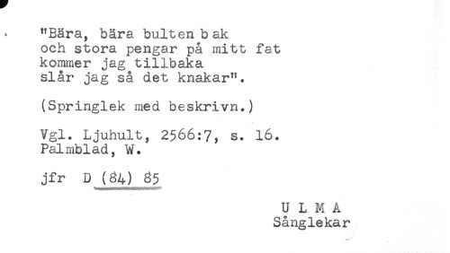 //// "Bära, bära bulten b ak //// och stora pengar på mitt fat //// kommer jag tillbaka //// slår jag så det knakar". //// (Springlek med beskrivn.) //// Vgl. Ljuhult, 2566:7, s. 16. //// Palmblad, W. //// jfr 0(84)65 ////
