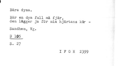 //// Bära dyna. //// Bär en dyn full mä fjär, //// den lägger ja för min hjärtans kär - //// Sandhem, Vg. //// D 195 //// S. 27 //// I F G H 2359 ////
