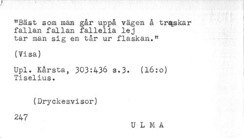 //// "Bäst som man går uppå vägen å traskar //// fallan fallan fallelia lej i //// tar man sig en tår ur flaskan." //// (Visa) //// ! //// t //// Upl. Kårsta, 303:436 s.3. (l6:o) i //// Tiselius. //// < //// (Dryckesvisor) ////
