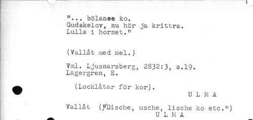 //// "... bölanee ko. //// Gudskelov, nu hör ja krittra. //// Lulla i hornet." //// * //// (Vallat med mel.) //// Vml. Ljusnarsberg, 2832:3, s.19. //// Lagergren, E. //// ^^ (Locklåtar för kor). //// ^ U L N A //// Vallat (/Dische, usche, lische ko etc.") //// ! U L M A ////