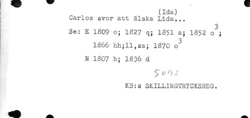 //// naaj //// Carlos svor att älska Lida... //// 3 //// Se: E 1809 o; 1827 q; 1851 a; 1852 o ; //// 3 //// 1866 hh;ll,ss; 1870 o //// N 1807 h; 1836 d //// K3:s SKILLINGTRYCKSREG. //// - Ht' //// ^^^ - ////