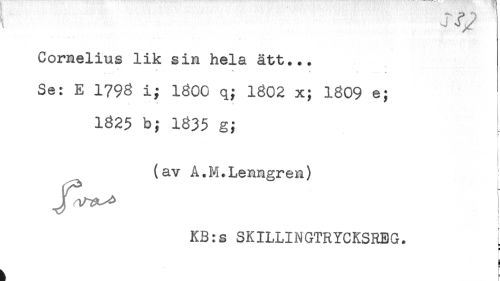 //// Cornelius lik sin hela ätt... //// " * - //// ' - - -- M //// Se: E 1798 i; 1800 q; 1802 x; 1809 e; //// \ ' * * //// 1825 b; 1835 g; //// (av A.M.Lenngren) //// c //// KB:s SKILLINGTRYCKSREG. ^ //// H //// t ////