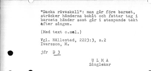 //// "Dacka rävaskall": man går före barnet, //// sträcker händerna bakåt och fattar tag i //// barnets händer samt går i stampande takt //// äfter sången. //// (Med text o.mel.) //// Vgl. Hällestad, 2223:3, s.2 //// Ivarsson, M. //// U L M A //// Sånglekar ////