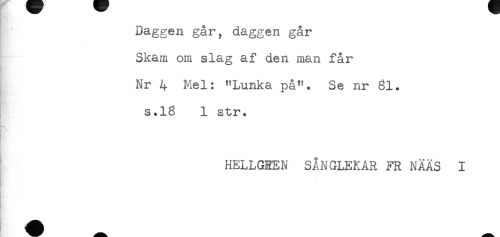 //// Daggen går, daggen går //// Skam om slag af den man får //// Nr 4 Mel: "Lunka på". Se nr Si. //// s.18 1 str. //// t //// HELLGEEN SÅNGLEKAR FR NÄÄS I //// * ////
