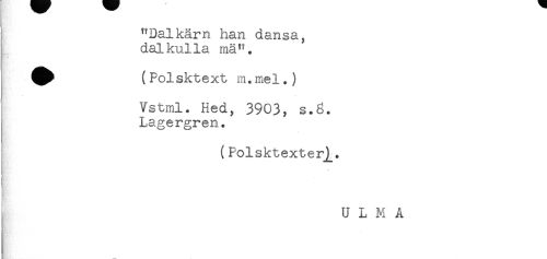 //// "Dalkärn han dansa, //// dalkulla mä't. //// ^^ (Polsktext m.mel.) //// I Vstml. Hed, 3903, s.6. //// Lagergren. //// (Polsktexterj,. //// ! //// U L M A ////