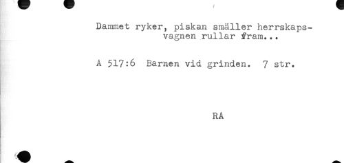 //// Dammet ryker, piskan smäller herrskaps- //// vagnen rullar fram... //// A 517:6 Barnen vid grinden. 7 str. //// Knt! '< -, //// . //// RA ////