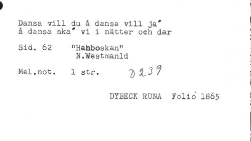 //// Dansa vill du å dansa vill ja" //// å dansa ska" vi i nätter och dar //// H //// H //// Sid. 62 "Hahboskan" ; //// N.Westmanld //// _ //// Mel.not. 1 str. 2) ^ ^ ^ j //// DYBECK RUNA Folio 186$ ! //// < //// ! //// ! //// ! ////