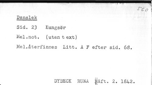 //// Danslek //// Sid. 23 Kungsör //// Mel.not. (utan t ext) //// Mel.återfinnes Litt. A F efter sid. 68. //// < //// i //// < //// 9 //// t //// DYBECK RUNA jiäft. 2. 1842. ////