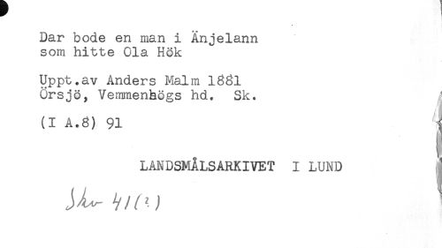 //// Dar bode en man i Änjelann //// som hitte Ola Hök //// Uppt.av Änders Malm 18&1 //// Örsjö, Vemmenhögs hd. Sk. //// An //// (I A.g) 91 ^ //// LANDSMÅLSARKIVET I LUND //// J ^ ^ / P J ////