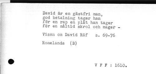 //// David är en gästfri man, //// god betalning tager han //// I för en rap en plåt han tager //// för en måltid skrol och mager - //// Visan om David Räf s. 69-76 //// Romelanda (B) //// ^ VFF: 1610, ////