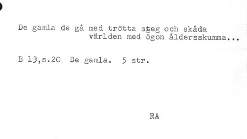 //// De gamla de gå med trötta s^eg och skåda //// världen med ögon åldersskumma... //// B 13,s.20 De gamla. 5 str. //// RÅ ////