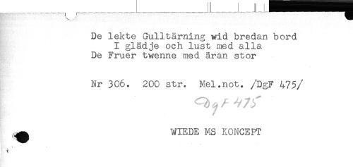 //// De lekte Gulltärning wid bredan bord //// I glädje och lust med alla //// De Fruer twenne med äran stor //// Nr 306. 200 str. Mel.not. /DgF 475 //// /^ WIEDE MS KONCEPT ////