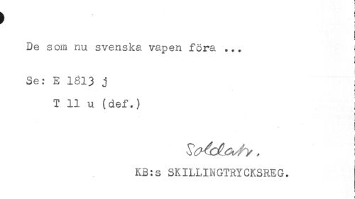 //// De som nu svenska vapen föra ... ^ //// ! //// Se: E 1813 j //// i //// T 11 u (def.) //// < //// KB:s SKILLINGTRYCKSREG. ////