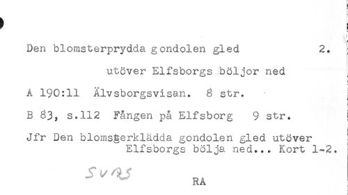 //// ) i //// * //// t //// ( //// Den blomsterprydda gondolen gled 2. //// ' //// utöver Elfsborgs böljor ned //// A 190:11 Älvsborgsvisan. 3 str. //// B 83, s.112 Fången på Elfsborg 9 str. ! //// i //// Jfr Den blomsterklädda gondolen gled utöver //// Elfsborgs bölja ned... Kort 1-2. //// RA //// i //// : ////