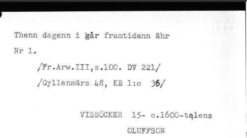 //// Thenn dagenn i ^år framtidenn ähr //// Nr 1. //// /Fr.Arw.III,s.lOO. DV 221 //// //Gyllenmärs 46, KB l:o 3$ //// /! //// VISBÖCKER 15- o.léOO-tqlens //// OLUFFSON ////