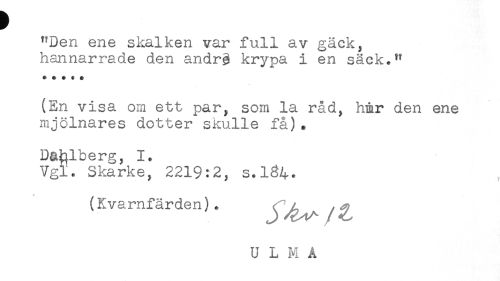 //// "Den ene skalken var full av gäck, //// hannarrade den andr^ krypa i en säck." //// * * + * $ //// (En visa om ett par, som la råd, hmr den ene //// mjölnares dotter skulle få). //// Dahlberg, I, //// Vgl. Skarke, 2219:2, s,l84. //// (Kvarnfärden) . ^ ^ //// U L M A ////