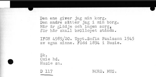 //// Den ene giver jag min korg. //// Den andre sätter jag i min borg. //// Här är glädje och ingen sorg, //// för här skall bröllopet stånda. //// IFGH 49^9/20. Uppt.Sofia Paulsson 1945 //// av egna minne. Född 1894 i Husie. //// Sk. //// ^ Oxie hd. //// * Husie sn. //// D 117 NORD. MUS. //// HL"'. ^^^H^H^HM))))^ ////