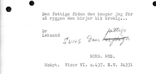 //// Den fattiga födan den knogar jag för //// så ryggen den börjar bli krokig... //// Dr //// Leksand //// /NORD. MUS. //// Mskpt. Visor VI. s.437. E.U. 24331 ////
