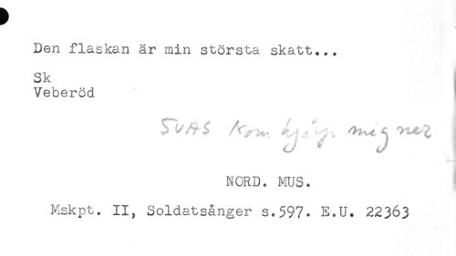 //// Den flaskan är min största skatt... //// Sk //// Veberöd //// J J //// * //// NCRD. MUS. //// Mskpt. II, Soldatsånger s.597. E.U. 22363 ////