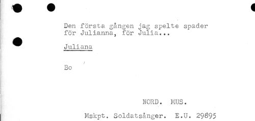 //// Den första gången jag spelte spader //// för Julianna, för Julia... //// ^ Juliana //// Bo //// s //// ! //// NORD. MUS. //// . //// I Mskpt. Soldatsånger. E.U. 29^95 ////