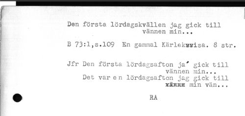 //// ) Den första lördagskvällen jag gick till //// vännen min... //// Bn"/ ^ //// B 73:l?s.l09 En gammal Kärlek-g&isa. g str. //// Jfr Den första lördagsafton ja^ gick till //// vännen min... //// Det var e n lördagsafton jag gick till //// xänim min vän... ////