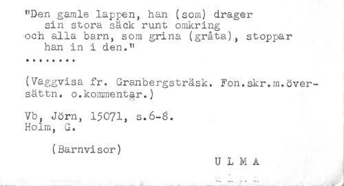 //// sin stora säck runt omkring //// och alla barn, som grina (gråta), stoppar //// han in i den." //// t //// (Vaggvisa fr. Granbergsträsk. Fon.skr.m.över- //// sättn. o.kommentar.) //// Vb, Jörn, 15C71, s.6-8. //// Holm, G. //// (Barnvisor) //// U L M A //// T,'** //// ... , J ////