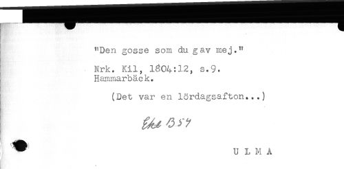 //// "Den gosse som du gav mej." //// . Nrk. Kil, 1^04:12, s.9^ //// Hammarbäck. //// (Det var en lördagsafton...) //// U L M A ////