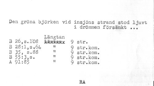 //// Den gröna björken vid insjöns strand stod ljuvt ! //// i drömmen försänkt ... } //// ! //// t //// Längtan //// B 26,s.l'0g MRjsxxx 9 str. //// B 28:l,s.64 " 9 str.kom. //// B 35, s.38 " 9 str.kom. //// B 55:3,s. " 9 str.kom. //// A 91:^5 " 9 str.kom. //// RÅ ////