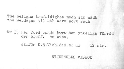 //// The heligha trefaldighet medh sin nådh //// the werdages til ath wara wört rådh //// Nr 3, Her Tord bonde hwrw han ynkeliga förråd- //// der bleff. en wisa. //// Jämför K.B.Visb.S:o No 11 12 str. //// STJERNELDS VISBOK //// -a' ////