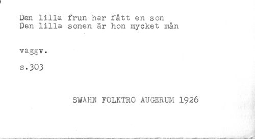 //// Den lilla frun har fått en son //// Den lilla sonen år hon mycket mån //// vaggv. //// s.303 //// SWAHN FOLKTRO ÅUGERUM 1926 ////