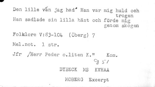 //// Den lille van jag had* Han var mig huld och //// trogen //// Han sadlade sin lilla häst och förde mig //// genom skogen //// Folklore V:63-104 (Öberg) 7 //// Mel.not. 1 str. //// Jfr /Herr Peder o.liten K." Kom. //// ^ y //// /DYBECK MS KVHAA //// MOBERG Excerpt //// . ___ ... .. ... ^ ////