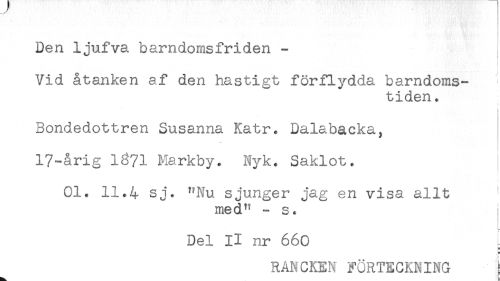 //// Den ljufva barndomsfriden - //// . //// Vid åtanken af den hastigt förflydda barndoms- //// tiden. //// i //// Bondedottren Susanna Katr. Dalabacka, //// 17-årig 1371 Markby. Nyk. Saklot. //// 01. 11.4 sj. "Nu sjunger jag en visa allt - //// med*' - s. //// Del II nr 660 ^ //// . F //// RANCKEN FÖRTECKNING ) ////