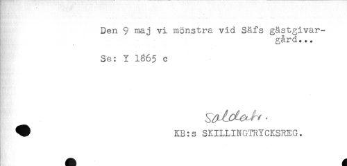 //// Den 9 maj vi mönstra vid Säfs gästgivar- //// gård... //// # //// Se: Y 1865 c //// ^ K3:s SKILLINGTRYCKSREG. ////
