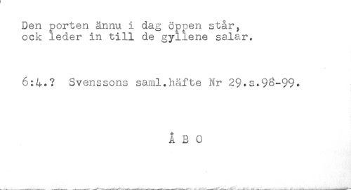 //// Den porten ännu i dag öppen står, //// ock leder in till de gyllene salar. //// 6:4*? Svenssons saml.häfte Nr 29.s.98-99. //// ÅBO ////