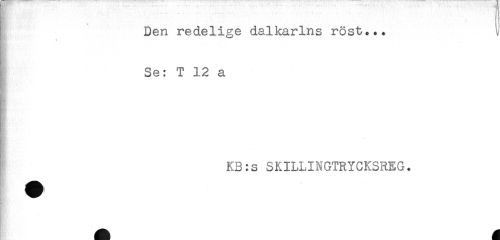 //// K //// Den redelige dalkarins röst... //// Se: T 12 a //// ! //// KB:s SKILLINGTRYCKSREG. //// [ ////